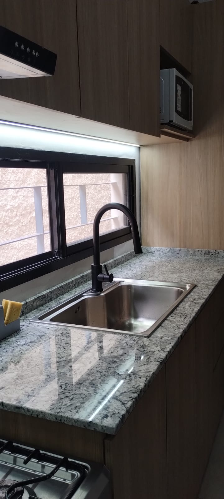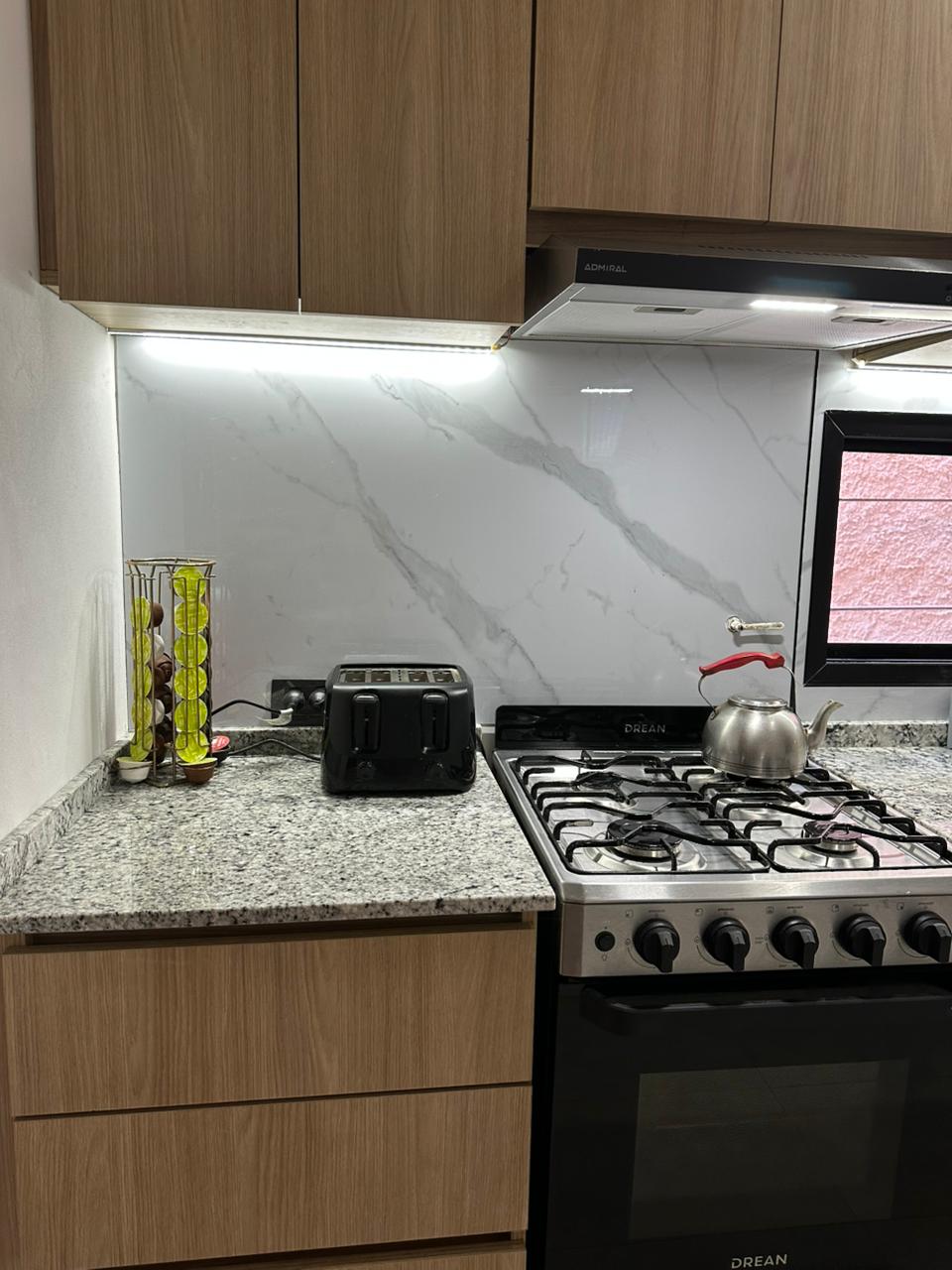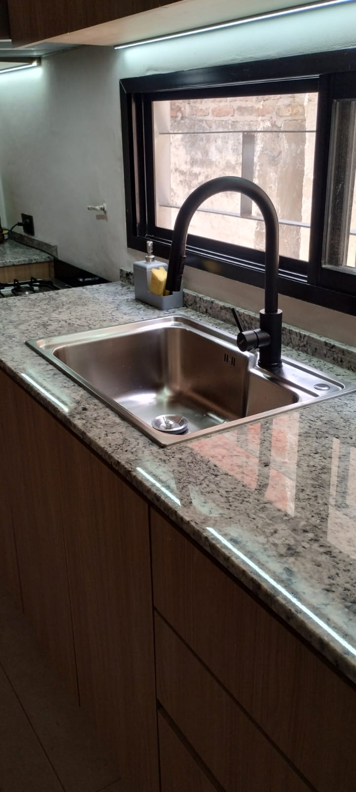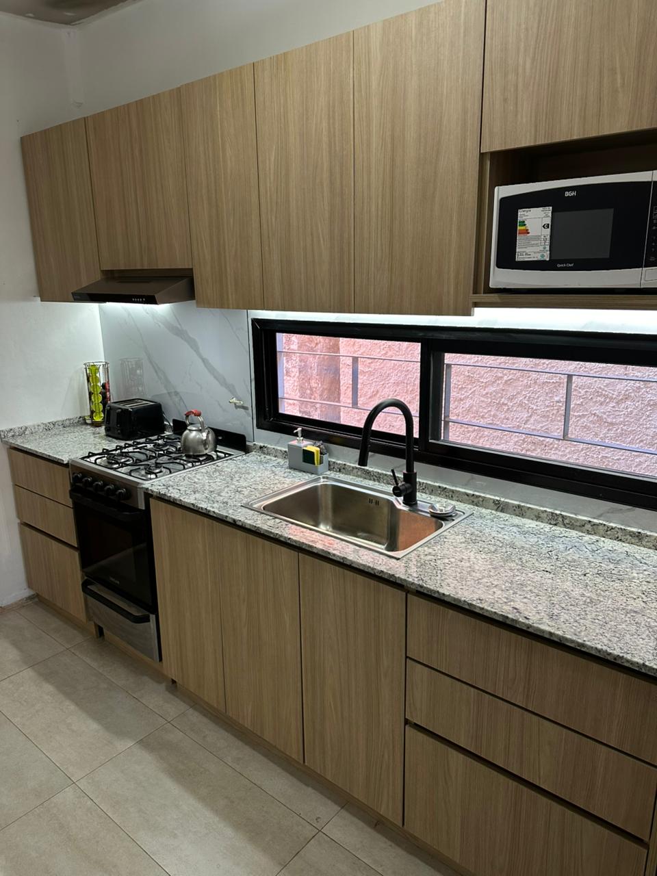 Este fue mi primer proyecto como profesional independiente, se modificó la instalación cloacal y la red de gas. Cambiamos la abertura existente por una mas baja y larga para poder agregar alacenas, incorporamos un nuevo solado de porcelanato y realicé el despiece de mobiliario a medida.