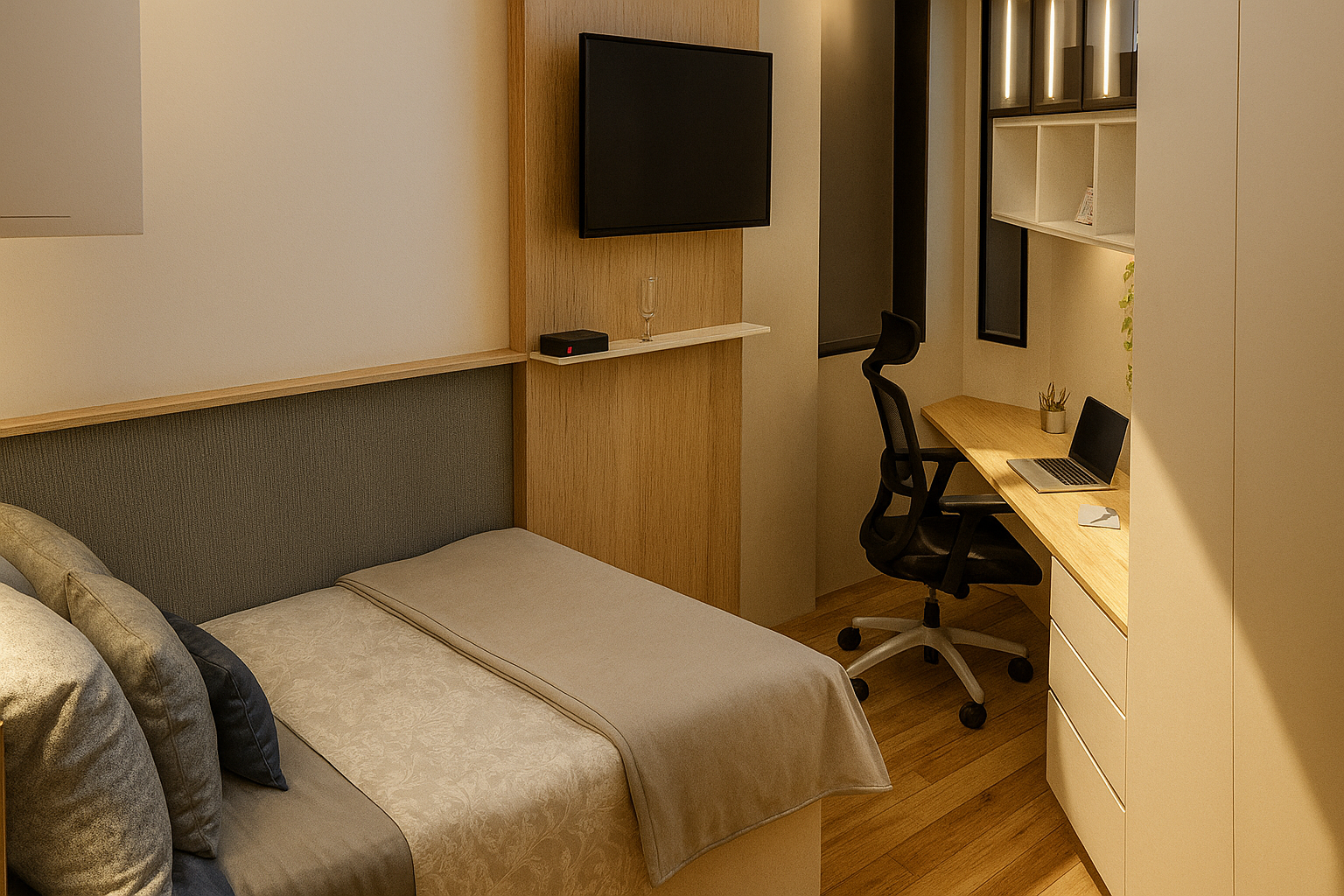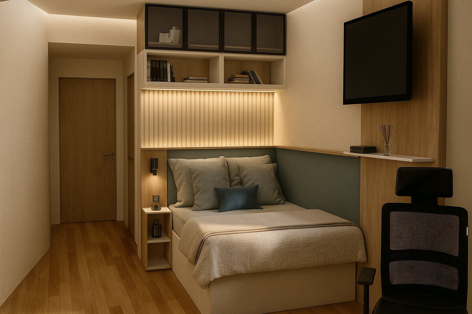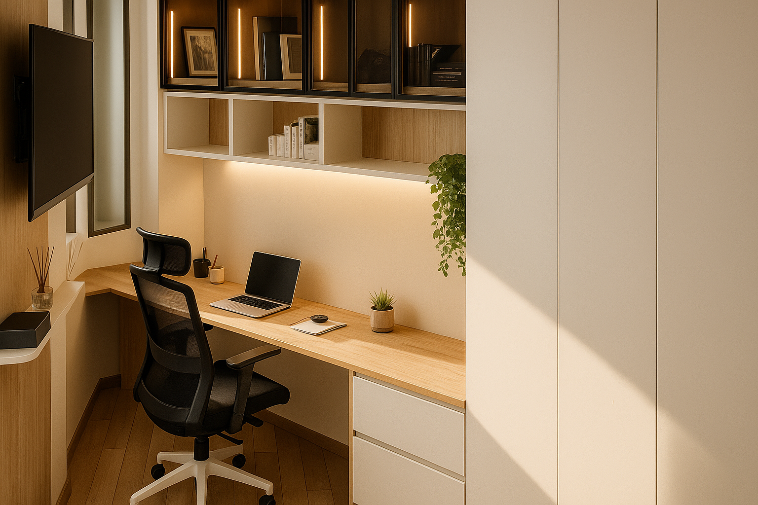 Este diseño consistió en potenciar el espacio angular con el que contaba el cliente. Realizamos todo el mobiliario a medida teniendo en cuenta sus necesidades y jugamos con una paleta de colores neutra para mayor amplitud visual.